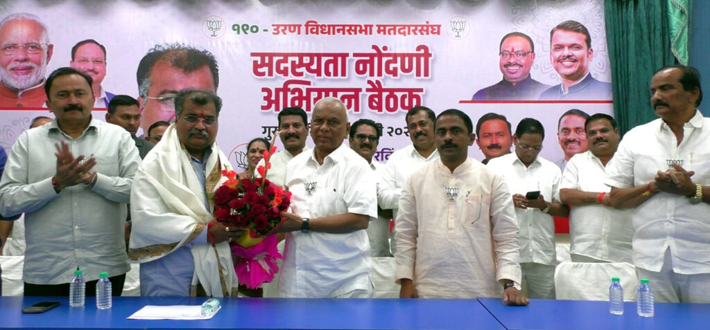 पनवेल प्रतिनिधी : उरण विधानसभा क्षेत्रातील भाजपा पदाधिकारी आणि कार्यकर्त्यांची संघटन पर्व आढावा बैठक पनवेल शहरातील श्री रामशेठ ठाकूर सामाजिक विकास मंडळाच्या सभागृहात भाजपचे प्रदेश कार्याध्यक्ष रविंद्र चव्हाण यांच्या उपस्थितीत गुरुवारी झाली. या बैठकीत रवींद्र चव्हाण यांनी उरण परिसरात सुरु असलेल्या सदस्यता नोंदणीचा आढावा घेत सदस्यता मोहिमेला अधिक गती देण्याच्या दृष्टीने प्रत्येक पदाधिकारी आणि कार्यकर्त्याने गावागावात आणि घराघरात जाऊन जनतेशी संवाद साधत त्यांना भाजपा परिवारात सामील करून घ्यावे, असे आवाहन केले.