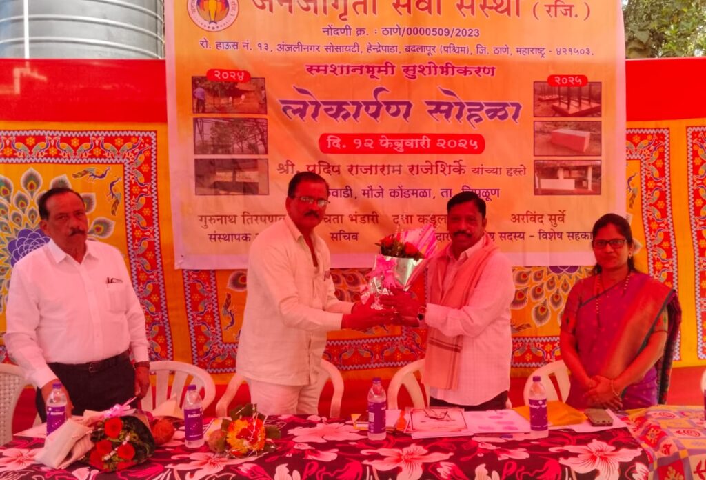 चिपळूण(प्रतिनिधी-गुरुनाथ तिरपणकर) :- जन्म तेथे मृत्यु अटळ आहे.जीवन मग ते कोणाचेही असो,जन्मापासून ते शेवटचा श्वास घेई पर्यंत या जगात कठीण प्रसंगांना सामना प्रत्येकाला करावाच लागतो.आपल्या आयुष्याची शेवटची यात्रा ही अंतयात्रा असते.अंतयात्रेची जागा माफक सुख सोयी असाव्यात त्या अनुषंगाने देहाला अग्नी दिला जातो ती दह वाहिनी,देह ठेवण्यासाठी चौथरा,पिंडदान दशक्रीया विधी व इतर धार्मिक विधी करण्यासाठी प्रशस्त चौधरा,अंतयात्रेला आलेल्या व्यक्तींना बसण्यासाठी धर्म शाळेत बैठक व्यवस्था अशा स्मशानभूमीचे सुशोभिकरणाचे काम करण्याची संधी जनजागृती सेवा संस्थेला मिळाली याचे सर्व श्रेय संस्थेचे जेष्ठ सदस्य अरविंद सुर्वे व जनजागृती ग्रुप सदस्यांना आहे,असे संस्थेचे अध्यक्ष गुरुनाथ तिरपणकर यांनी मनोगतामध्ये आवर्जून सांगितले.सर्व प्रथम स्मशानभूमीत जाऊन धर्मशाळेतील भिंतीवरील लावलेल्या”लोकार्पण सोहळा”या संगलरवरी पथ्थरचे जेष्ठ समाजसेवक प्रदिप राजाराम राजेशिर्के यांच्या हस्ते पुष्पहार अर्पण श्रीफळ वाढवून करण्यात आले.त्यानंतर कोंडमळा येथील समाजसेवक व संस्थेचे जेष्ठ सदस्य अरविंद सुर्वे यांच्या लक्ष्मी नारायण निवासस्थानाच्या भव्य प्रांगणात ‘लोकार्पण सोहळा’संपन्न झाला.याप्रसंगी समाजसेवक अरविंद सुर्वे यांच्या हस्ते मानसिंग राजेशिर्के,प्रदिप राजाराम राजेशिर्के,काॅनट्रॅक्टर संतोष राजेशिर्के यांचा संस्थेच्यावतीने शाल,श्रीफळ,संस्थेचे आभार पत्र,पुष्पगुच्छ देऊन यथोचित सत्कार करण्यात आला.यावेळी प्रमुख पाहुणे मानसिंग राजेशिर्के यांनी संस्थेच्या कार्याचे कौतुक केले व संस्थेने सुशोभिकरणासाठी योगदान दिल्याबद्दल आभार मानले.जेष्ठ सदस्य अरविंद सुर्वे यांनी आपल्या प्रास्ताविकात संस्थेचे अध्यक्ष व सचिव यांचा परिचय करून दिला व संस्थेच्या कार्याचा आढावा घेतला.स्मशानभूमीचे संपुर्ण काम पुर्ण झाल्यामुळे काॅनट्रॅक्टर संतोष राजेशिर्के यांना उवर्वरित रकमेचा धनादेश संस्थेचे अध्यक्ष गुरुनाथ तिरपणकर यांच्या हस्ते देण्यात आला.तसेच संस्थेचे जेष्ठ सदस्य अरविंद सुर्वे यांच्या संकल्पनेतून व विशेष सहकार्यातून स्मशानभूमीचे संपुर्ण सुशोभिकरण झाल्यामुळे त्यांचा संस्थेच्या वतीने यथोचित सत्कार करण्यात आला.कार्यक्रमाचे सूत्रसंचालन मानसिंग राजेशिर्के यांनी केले.आभार प्रदर्शन सचिव सौ.संचिता सचिन भंडारी यांनी केले.याप्रसंगी विजय राजेशिर्के,रमेश राजाराम राजेशिर्के,रविंद्र दत्तात्रय शिर्के,राजेंद्र दत्तात्रय शिर्के,प्रकाश आत्माराम राडे, ग्रामस्थ व इतर मान्यवर उपस्थित होते.शेवटी राष्ट्रगीताने व अल्पोपहाराने कार्यक्रमाची सांगता झाली.