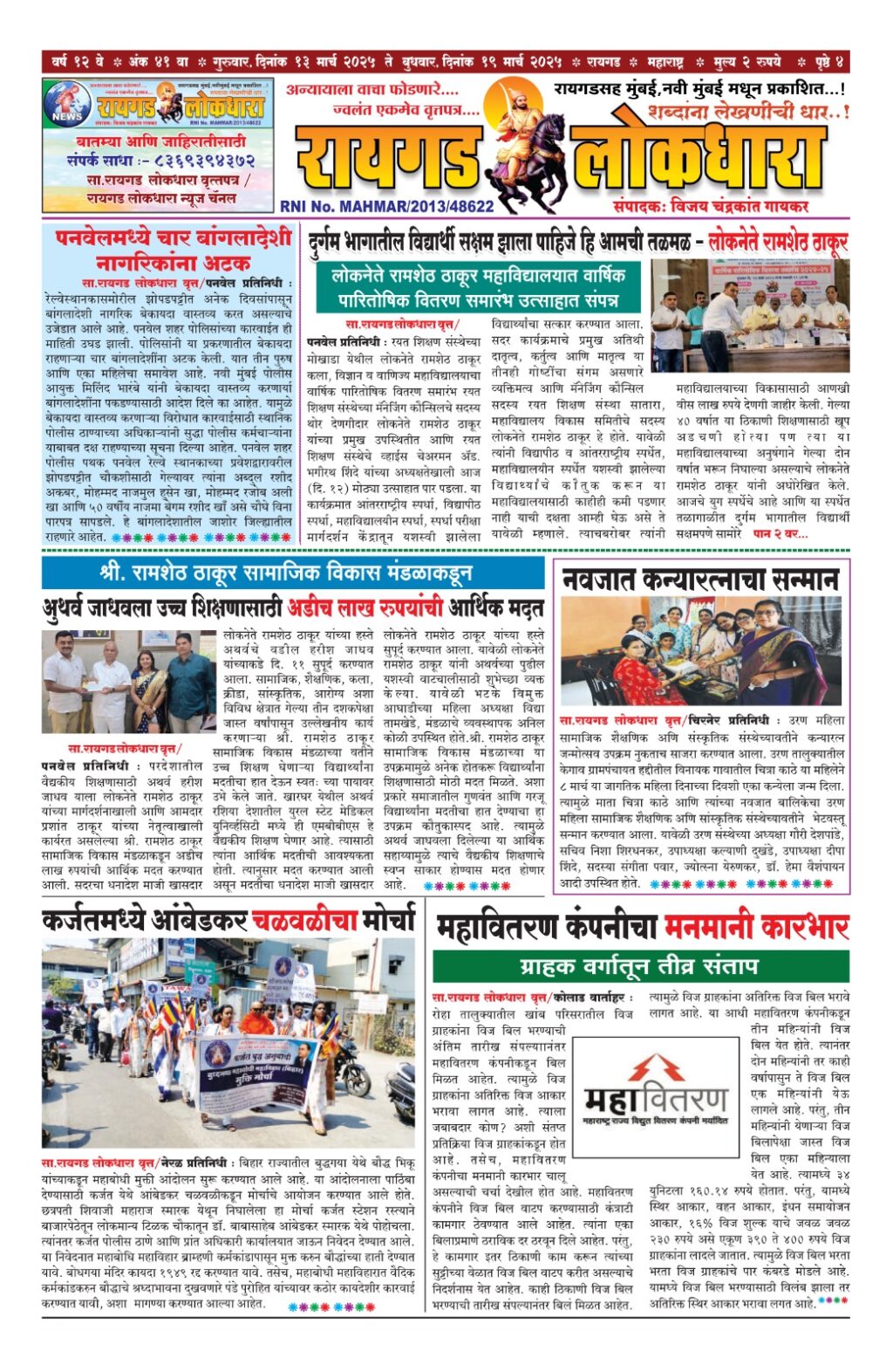 नवीमुंबई सा.रायगड लोकधारा वृत्तपत्र ( दि. 13 मार्च 2025 ते दि. 19 मार्च 2025 विजय चंद्रकांत गायकर March 14, 2025 Guruwar 13 march 2025 to 19 march 2025 raigad lokdhara Post navigation Previous घे भरारी महिला ग्रुप तर्फे रांजणखार येथे जागतिक महिला दिन संपन्न.Next भयंकर! आधी आठ वर्षाच्या मुलीला फेकलं, नंतर आईनेही 29व्या मजल्यावरून मारली उडी; मॅरॅथॉन सोसायटीतील घटना Related Stories तिसऱ्या मुंबई साठी २०१३ चा भू संपादन कायदा लागू करण्याची मागणी… नवीमुंबई तिसऱ्या मुंबई साठी २०१३ चा भू संपादन कायदा लागू करण्याची मागणी… March 1, 2026 पुरातन मंदिरे देखिल आता सुरक्षित नाहीत ? नवीमुंबई स्थानिक भुमिपुत्रांची आक्रमक भुमिका… नवीमुंबई पुरातन मंदिरे देखिल आता सुरक्षित नाहीत ? नवीमुंबई स्थानिक भुमिपुत्रांची आक्रमक भुमिका… February 25, 2026 छत्रपती शिवाजी महाराज जयंतीनिमित्त उलवेनोडमध्ये भव्य मिरवणूक व ‘महाराष्ट्राचा शाहिरी बाणा’ कार्यक्रम… नवीमुंबई छत्रपती शिवाजी महाराज जयंतीनिमित्त उलवेनोडमध्ये भव्य मिरवणूक व ‘महाराष्ट्राचा शाहिरी बाणा’ कार्यक्रम… February 18, 2026