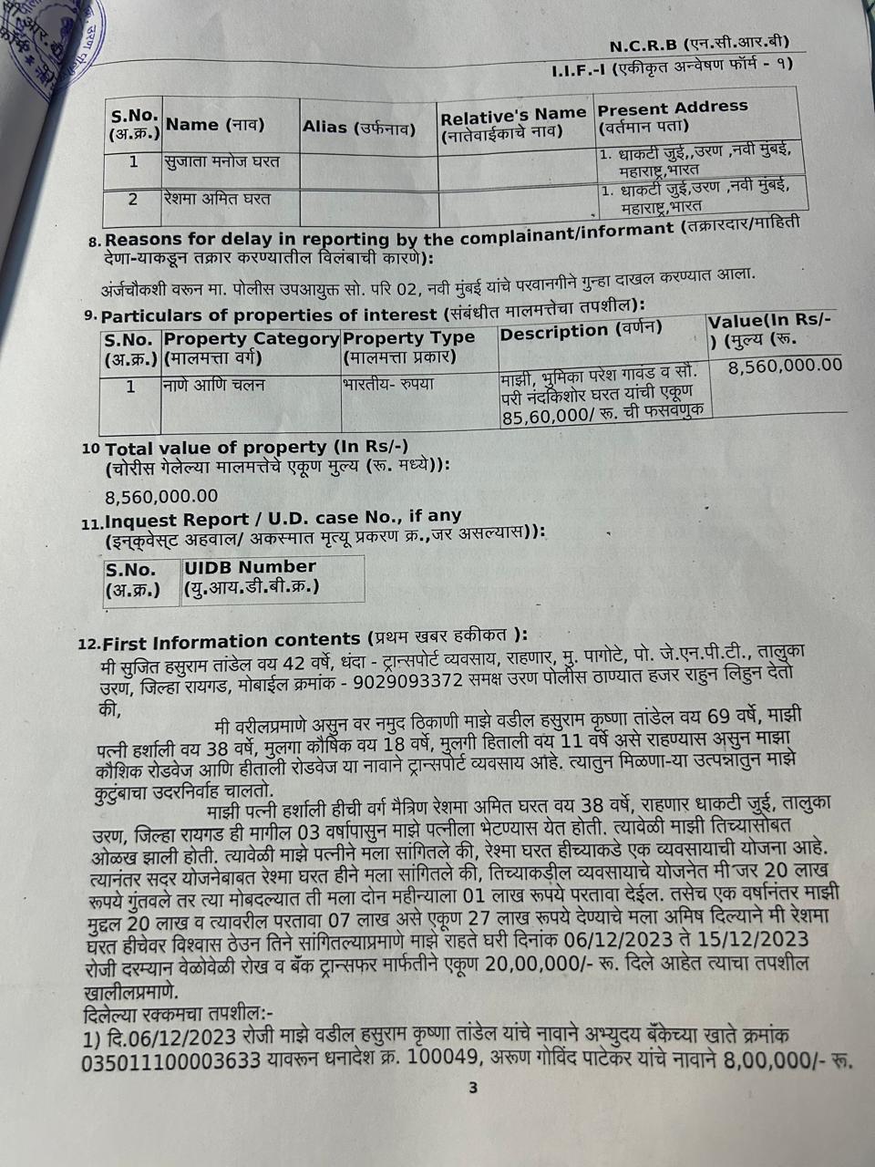 उरण तालुक्यातील पागोटे, जेएनपीटी येथे ट्रान्सपोर्टचा व्यवसाय करणारे सुजित हसुराम तांडेल यांचा कौशिक रोडवेज तसेच हिताली रोडवेज या नावाने ट्रान्सपोर्ट व्यवसाय आहे. त्यांची पत्नी हर्षाली सुजित तांडेल हिची वर्ग मैत्रीण रेशमा अमित घरत राहणार धाकटी जुई, उरण हिचे मागील तीन वर्षापासून हर्षाली तिच्या घरी येणे जाणे होते. त्या दरम्यान हर्षाली हिने आपले पती सुजित तांडेल यांना माझी मैत्रीण रेशमा घरत तिच्याकडे एक व्यवसायाची योजना आहे असे सांगितले.त्याप्रमाणे सुजित तांडेल यांनी रेश्मा घरत यांच्याकडून ती योजना समजून घेतली. तिच्याकडे असलेल्या या व्यवसायाच्या योजनेत जर वीस लाख रुपये गुंतवले तर त्या मोबदल्यात रेश्मा घरत ही दोन महिन्याला एक लाख रुपये परतावा देईल, तसेच एक वर्षानंतर मी गुंतवलेली मुद्दल वीस लाख रुपये व त्यावरील परतावा सात लाख असे एकूण सत्तावीस लाख रुपये देण्याचे आमिष दिले. त्याप्रमाणे रेश्मा हिच्या म्हणण्यानुसार तसेच तिच्यावर विश्वास ठेवून सुजित तांडेल यांनी तिच्या घरी दिनांक ०६/१२/२०२३ ते दिनांक १५/१२/२०२३ रोजीच्या दरम्यान वेळोवेळी रोख रक्कम तसेच बँकेच्या ट्रान्सफर मार्फत एकूण वीस लाख रुपये दिले.