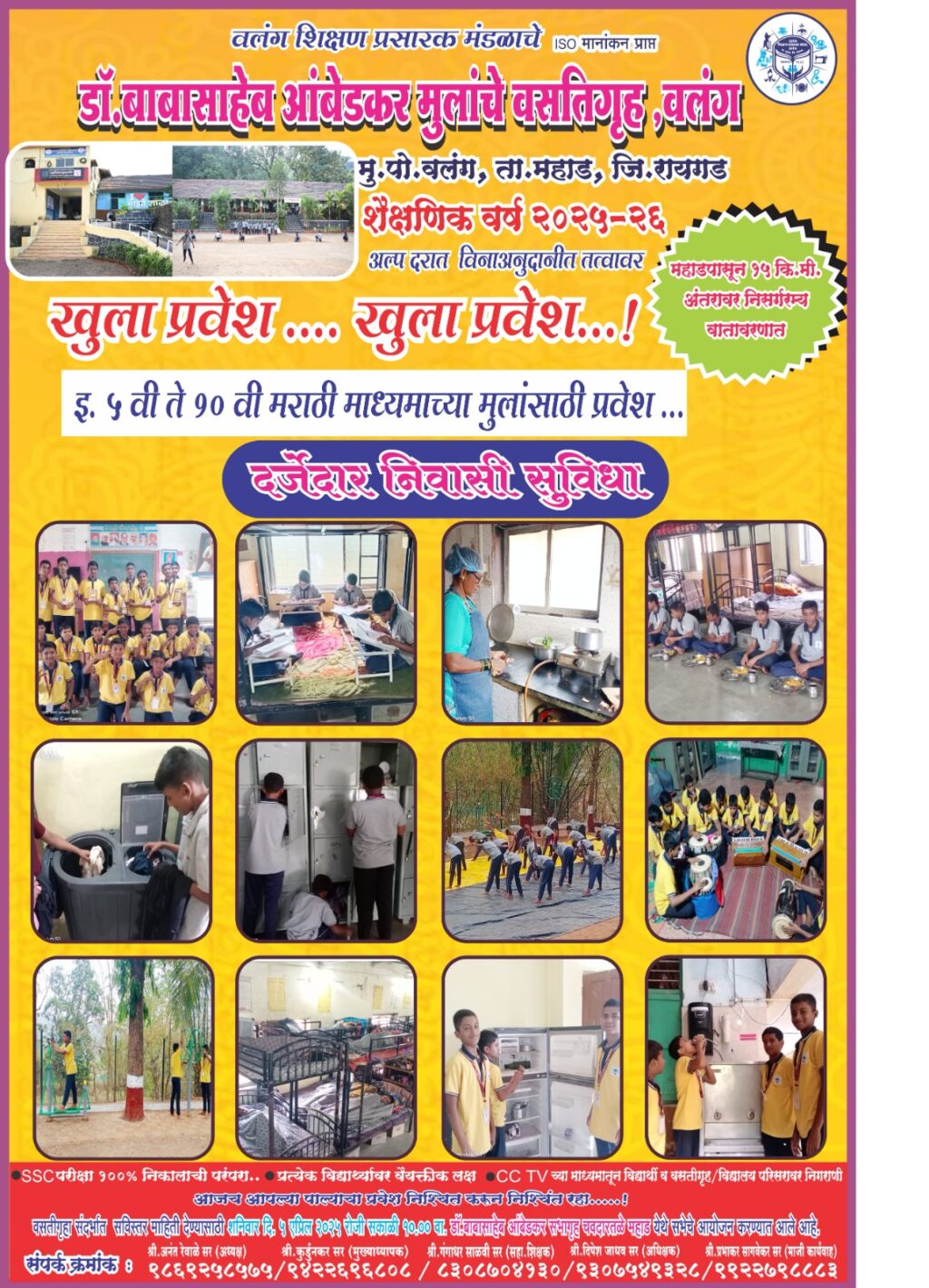 महाड प्रतिनिधी : वलंग शिक्षण प्रसारक मंडळाचे डॉ.बाबासाहेब आंबेडकर मुलांचे वसतिगृह,वलंग,ता.महाड येथे इ.५वी ते १०वी मराठी माध्यमाचे मुलांसाठी प्रवेश सुरू करण्यात आला आहे. एस सी व एस टी प्रवर्गासाठी ३० जागा आरक्षित असून मोफत प्रवेश आहे तर विनाअनुदानित तत्वावर पालकांचे आग्रहास्तव खुला-अराखीव जातीची अट नाही अशा २० अधिकच्या जागा विद्यार्थ्यासाठी अल्प फीमध्ये प्रवेश उपलब्ध करून देण्यात येत आहे. तरी महाड शहर परिसरातील व ग्रामीण भागातील तसेच कोकणातील व सध्या विरार,’नालासोपारा’,दिवा येथे वास्तव्यास असलेल्या पालकांनी आपल्या मुलांसाठी प्रवेश निश्चित करावा व दर्जेदार निवासी शैक्षणिक सुविधेचा लाभ घ्यावा. अधिक माहितीसाठी शनिवार दि.५ एप्रिल २०२५ रोजी चवदार तळे महाड येथील डॉ.बाबासाहेब आंबेडकर सभागृहात सकाळी १० वा.प्रवेशासंबंधी माहिती शिबीराचे आयोजन संस्था अध्यक्ष श्री.अनंत रेवाळे साहेब यांच्या मार्गदर्शनाखाली आयोजीत केले आहे. तरी सर्वांनी याचा लाभ घ्यावा.
