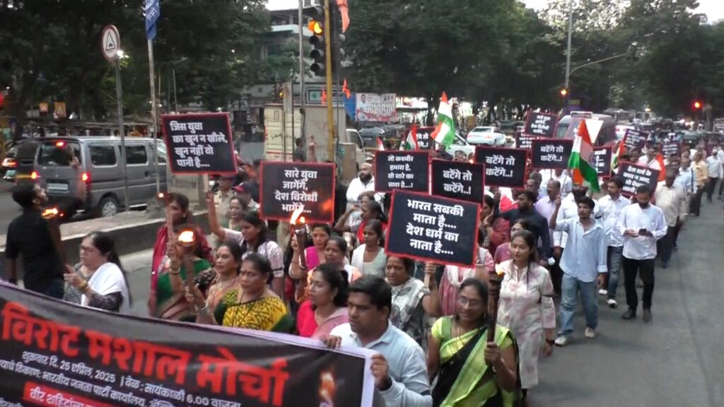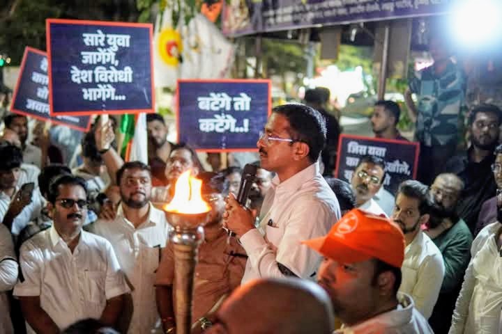 काश्मीरमधील पहलगाम येथे निष्पाप पर्यटकांवर झालेल्या अमानुष दहशतवादी हल्ल्याचा निषेध करण्यासाठी आणि मृत्युमुखी पडलेल्या नागरिकांना श्रद्धांजली वाहण्यासाठी शुक्रवारी सायंकाळी भारतीय जनता पार्टी युवा मोर्चाच्यावतीने पनवेल परिसरातील खांदा कॉलनी ते नवीन पनवेल दरम्यान विराट मशाल मोर्चा आयोजित करण्यात आला होता. आमदार प्रशांत ठाकूर, भाजप उत्तर रायगड जिल्हाध्यक्ष अविनाश कोळी यांच्या प्रमुख उपस्थितीत झालेल्या या मशाल मोर्चात पदाधिकारी, कार्यकर्त्यांसह, युवक, युवती, शेकडो नागरिकांनी सहभाग घेतला होता. यावेळी “भारत माता की जय” घोषणांनी परिसर देशभक्तीने निनादला होता. तर पाकिस्तानचा झेंडा जाळत “दहशतवाद मुर्दाबाद”, “पाकिस्तान मुर्दाबाद” अशा घोषणा देत घोषणांमधून केवळ संताप नव्हे, तर दृढ निर्धाराचे प्रतिबिंब उमटले. हा मोर्चा निषेधाच्या पलीकडे जाऊन, केंद्र सरकारच्या दहशतवादविरोधी कठोर आणि निर्णायक धोरणांना जाहीर पाठिंबा दर्शवणारा ठरला. देशाच्या एकात्मतेला हादरा देणाऱ्या प्रयत्नांचा खात्मा करण्यासाठी सरकारच्या पाठीशी अखंडपणे उभे राहण्याचा निर्धार उपस्थितांनी व्यक्त केला. हल्ल्यात हुतात्मा झालेल्या निष्पाप पर्यटक आणि शहीद जवानांप्रती श्रद्धांजली अर्पण करताना, त्यांच्या कुटुंबीयांच्या दुःखात संपूर्ण देश सहभागी असल्याचे भावनिक शब्दांत व्यक्त करण्यात आले.
