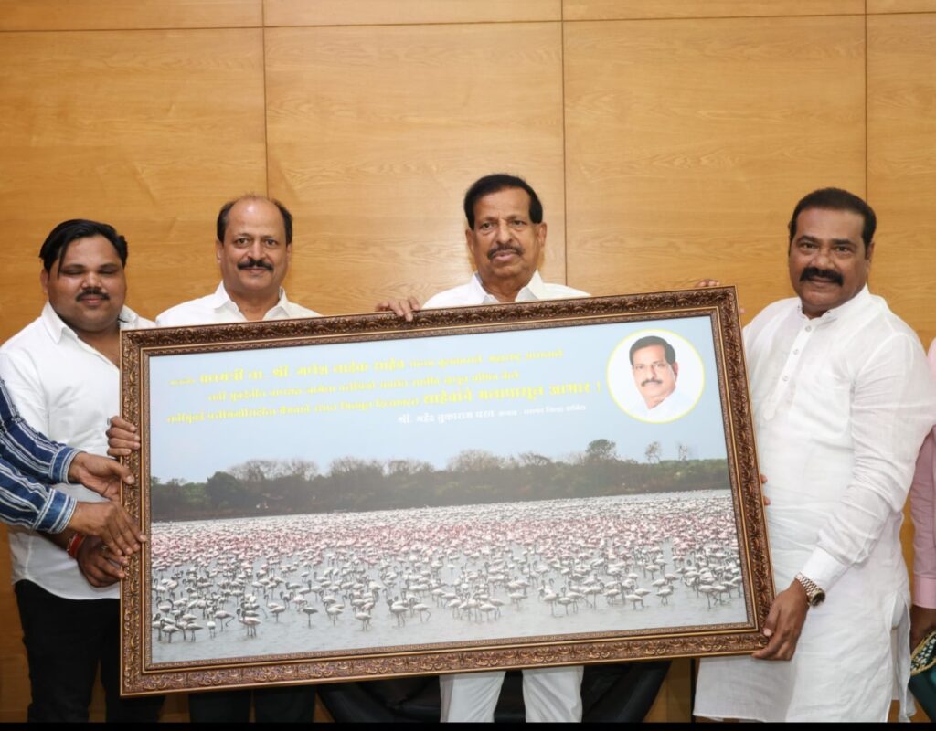 उरण दि. २९ ( विठ्ठल ममताबादे ) : महाराष्ट्र राज्याचे वनमंत्री गणेश नाईक यांनी फ्लेमिंगोंचे अस्तित्व टिकून राहावे म्हणून नवी मुंबईतील पाणथळ जागा आरक्षित करण्याचा महत्त्वपूर्ण निर्णय नुकताच घेतला आहे. त्याबद्दल आंतरराष्ट्रीय कामगार नेते आणि काँग्रेसचे रायगड जिल्हाध्यक्ष महेंद्रशेठ घरत यांनी वनमंत्री गणेश नाईक यांचे ‘व्हाईट हाऊस’ येथे जाऊन अभिनंदन केले. यावेळी फ्लेमिंगोंच्या नयनरम्य छायाचित्राची फोटोफ्रेम गणेश नाईक यांना महेंद्रशेठ घरत यांनी भेट म्हणून दिली. यावेळी महेंद्रशेठ घरत म्हणाले, “नाईक साहेब, आपण फ्लेमिंगोंना वाचविण्यासाठी खूप महत्त्वपूर्ण निर्णय घेतला आहे. फ्लेमिंगोंमुळे नवी मुंबईला एक वेगळी ओळख मिळाली आहे. वनमंत्री म्हणून आपला हा निर्णय कायम स्मरणात राहील, त्यामुळे आपले अभिनंदन करणे माझे कर्तव्य आहे. आपण यापुढील काळातही भूमिपुत्रांच्या आणि निसर्गाच्या रक्षणासाठी कटिबद्ध राहाल, अशी आम्हाला आशा आहे. अभिनंदन गणेश नाईक साहेब!”अशा शब्दात महेंद्रशेठ घरत यांनी मंत्री नाईक यांचे आभार मानले.