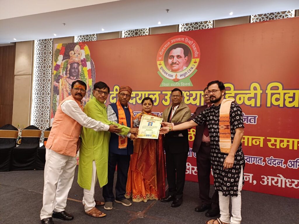 मानसिक आरोग्य आणि हिप्नोथेरपीच्या माध्यमातून समाजासाठी केलेल्या कार्याची प्रशंसा यावेळी विद्यापीठ प्रशासनाने केली. यावेळी मुख्य अतिथी पुर्व कुलपति- रानी लक्ष्मीबाई केंद्रीय कृषी विश्वविद्यालय झांशी, पद्मश्री डाॅ.अरविंद कुमार,कुलपति प.दिनदयाल उपाध्याय हिंदी विध्यापीठ अध्यक्ष डाॅ. इन्दु भुषण मिश्रा,सुप्रसिध्द कथा वाचिका वृन्दावन धाम मथुरा मुख्य वक्ता सुश्री दिपा मिश्रा,राष्ट्रीय पर्यावरणविद आणि वर्ड रेकाॅड धारी बागबहरा जिल्हा महासमुंद(छत्तीसगढ) विशिष्ट अतिथि डाॅ.विश्वनाथ पाणिग्रहि या मान्यवरांच्या उपस्थितीत सदर पदवी प्रधान करण्यात आली.