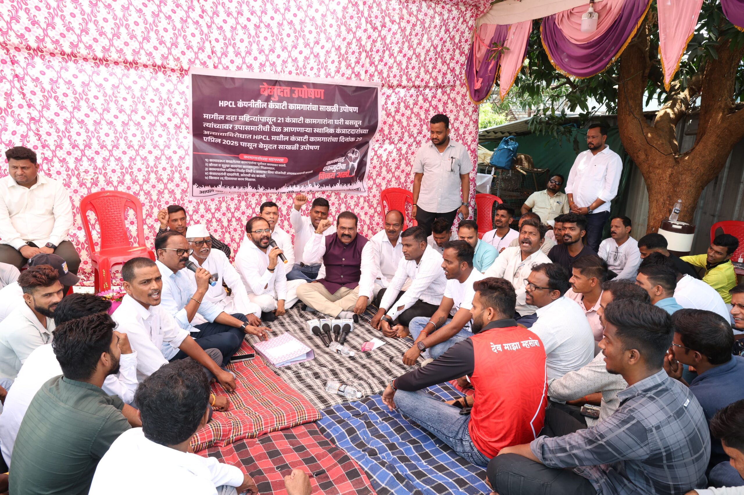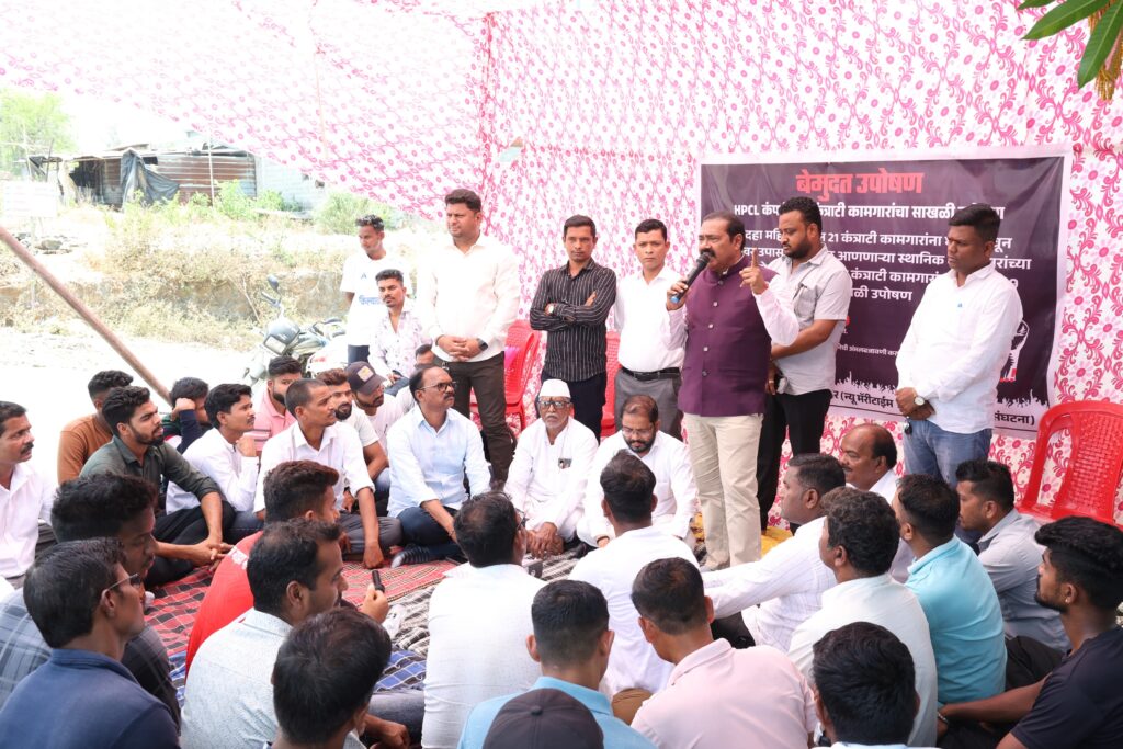 कंपनी व्यवस्थापन कंत्राटदाराला किती पैसे देते, कंत्राटदार कामगारांना किती पगार देतो, त्यात मॅनेजमेंटचा हिस्सा किती, याचा जाब विचारणे चूक नाही. त्यामुळे आपल्या न्याय हक्कांसाठी कामगारांनी संघटना बांधली असेल तर त्यात कामगारांची चूक काय, कायद्यानुसार वेतन हे मिळायलाच हवे आणि अशावेळी २१ कंत्राटी कामगारांना कामावरून कमी केले आहे, हे लाजिरवाणे आहे. गेले दहा महिने हे स्थानिक कामगार बेरोजगार आहेत, त्यांना योग्य न्याय देण्यासाठी मी सर्वोतोपरी प्रयत्न करीन.मध्यंतरी आमदार महेश बालदी यांनीही कंत्राटदारांना समज दिली होती तरीही व्यवस्थापन वा ठेकेदार मुजोरीने वागत असेल तर तुम्हाला तुमची जागा दाखवणारच, असा इशारा आंतरराष्ट्रीय कामगार नेते महेंद्रशेठ घरत यांनी यावेळी दिला.न्यू मॅरिटाईम अण्ड जनरल कामगार संघटनेच्या मार्गदर्शनाखाली स्थानिक बेरोजगार २१ कामगारांनी चार दिवसांपासून एचपीसीएलच्या गेटसमोर साखळी उपोषण सुरू केले आहे. या उपोषणस्थळी महेंद्रशेठ घरत यांनी कामगार दिनी भेट देऊन कामगारांशी संवाद साधला आणि मार्गदर्शन केले.यावेळी जेष्ठ नेते नाना म्हात्रे, युवा नेते निखिल डवले, रजनीकांत माळी, देविदास म्हात्रे,न्यू मॅरिटाईम अण्ड जनरल कामगार संघटनेचे सरचिटणीस वैभव पाटील, मुरलीधर ठाकूर, अरुण म्हात्रे, आनंद ठाकूर, घनश्याम पाटील,विवेक म्हात्रे, राजेंद्र भगत, किरण कुंभार स्थानिक ग्रामस्थ तसेच शेकडोच्या संख्येने कामगार उपस्थित होते.