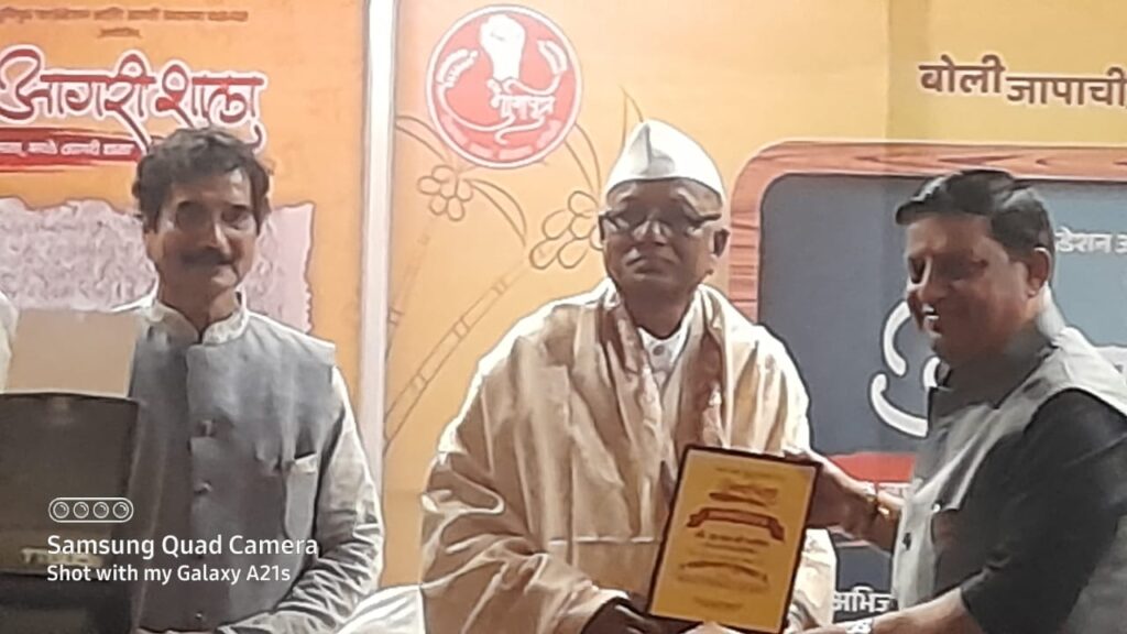 उरण दि. २९ विठ्ठल ममताबादे : आगरी ग्रंथालय चळवळ आणि भुमीपुत्र फाऊंडेशन यांनी आयोजित केलेल्या आगरी शाला उपक्रमात भिवंडीचे खासदार बाल्यामामा यांच्या शुभहस्ते रायगडभूषण प्रा एल बी पाटील यांना आगरी बोलीतील ” साहित्य रत्न पुरस्कार ” हा मानाचा पुरस्कार टाऊन हॉल ठाणे येथे मान्यवरांच्या उपस्थितीत प्रदान करून त्यांना गौरविण्यात आले.