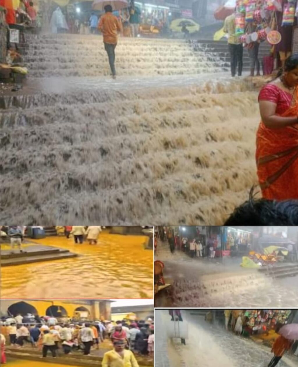 कांतीलाल पाटील : जेजुरी,दि.२८ : जेजुरी गडावर देवाच्या अंगणात नुसते पाणीच पाणी. पाणी धबधब्यासारखे ओसांडून वाहत होते. जेजुरी गडावर तुफान पाऊस बरसत आहे. पावसामुळे पायऱ्यावरून पाणी धबधबा सारखे वाहत आहे. खंडेरायाच्या दर्शनासाठी आलेल्या भक्तांना हे नयनरम्य दृश्य अनुभवता आले आहे. जेजुरी गडावर गेल्या आठ दिवसापासून तुफान पाऊस होतोय.जेजुरीत काल रात्री मुसळधार पाऊस झाला.
