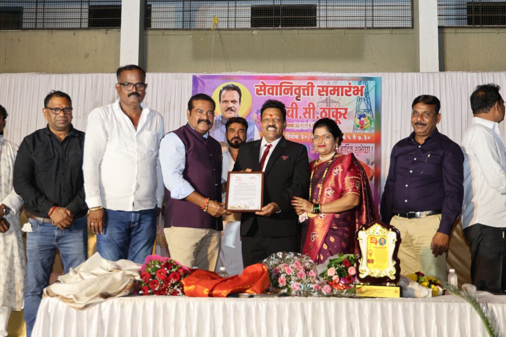 चिरनेर येथील बी. सी. ठाकूर यांचा पूर्वाश्रमीचा जीवनपट पाहिला तर अंगावर काटा येत असल्याचे महेंद्र घरत यांनी नमूद केले. एकेकाळी त्यांची शिक्षण घेण्याची परिस्थिती नसताना देखील, अगदी हालाखीच्या परिस्थितीत या बुद्धिमान व्यक्तिमत्वाने शिक्षण घेऊन त्यांनी इलेक्ट्रिक बॉर्डात एक महत्त्वाचे उच्च पद मिळविले. या पदावर काम करतांना ग्राहकांची तसेच महावितरण कंपनीची प्रतिष्ठा सांभाळून अत्यंत जबाबदारीने कायद्याच्या कक्षेत राहून त्यांनी काम पाहिले. एवढेच नव्हे तर सामाजिक जबाबदारी म्हणून ते जनसामान्यांसाठी तत्परतेने काम करत आले आहेत. ते दूरदृष्टी लाभलेले धडाकेबाज नेतृत्व आहे. विचारांना दिशा देणारे नेतृत्व आहे. त्यांची समाजाला खूप मोठी गरज आहे. अशा शब्दात घरत यांनी त्यांच्या कार्याचा गौरव केला. याप्रसंगी सत्कारमूर्ती बी. सी. ठाकूर आणि यांच्या सहचारिणी माई ठाकूर यांचा सपत्नीक साडी चोळी पुष्पगुच्छ व भेटवस्त देऊन अनेक चाहत्यांनी सत्कार केला.