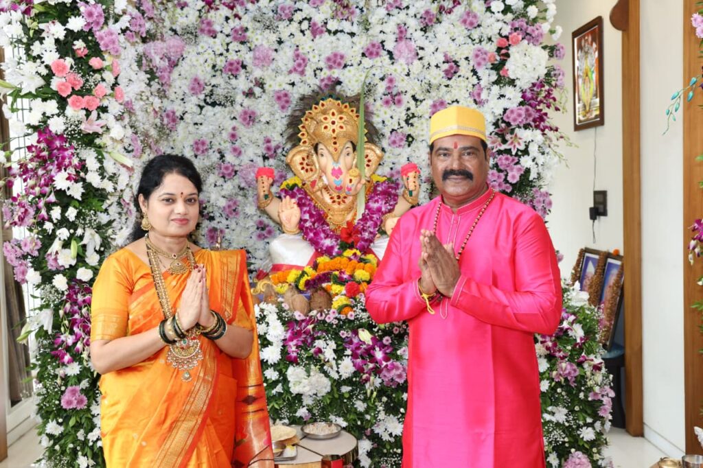 उरण दि. २९ (विठ्ठल ममताबादे ) : संपूर्ण देशभरात विशेषतः महाराष्ट्रात गणेश चतुर्थीच्या शुभमुहूर्तावर गणरायाचे आगमन भाविकांनी बुधवारी (ता. २७) जल्लोषात केले. तसेच गणरायाचे आगमन आंतरराष्ट्रीय कामगार नेते आणि काँग्रेसचे रायगड जिल्हाध्यक्ष महेंद्रशेठ घरत यांच्या `सुखकर्ता’ बंगल्यावर झाले. सुंदर रांगोळ्या, विविध प्रकारच्या फुलांची देखणी आरास आणि वाद्यांच्या गजरात गणरायाचे स्वागत महेंद्रशेठ घरत आणि शुभांगीताई घरत यांनी `सुखकर्ता’वर केले. यावेळी बुधवारी सकाळी अकरा वाजता गणरायाला अभिषेक करण्यात आला. त्यानंतर घरत परिवारातील कुटुंबीयांनी एकत्र येऊन सवाद्य आरती केली.