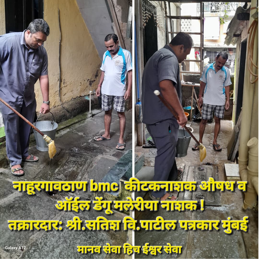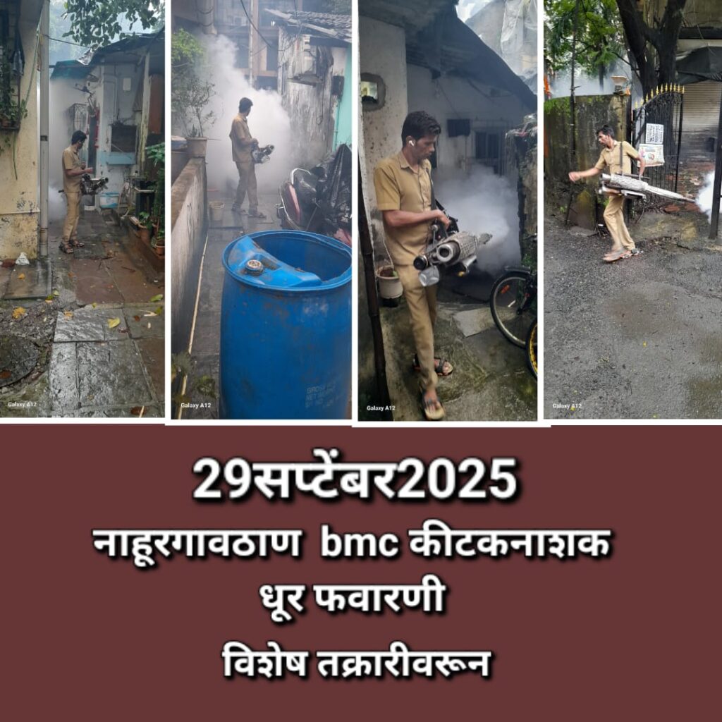 मुंबई प्रतिनीधी : (सतिश पाटील) – नाहूरगावठाण श्री.सतिश वि.पाटील यांच्या तक्रारीवरून धूर फवारणी, डेंगू मलेरिया उच्छाटन केन्द्र (bmc) मार्फत वेळोवेळी सहकार्य केले जाते.