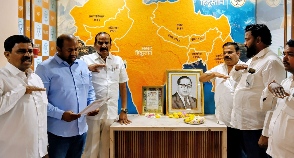 पनवेल / भारताच्या संविधान स्वीकृती दिनानिमित्त पनवेल तालुका व शहर भाजपच्या मध्यवर्ती कार्यालयात आज (२६ नोव्हेंबर) संविधान दिन उत्साहात साजरा करण्यात आला. यावेळी भाजपचे राज्य परिषद सदस्य अरुणशेठ भगत, जिल्हा उपाध्यक्ष प्रल्हाद केणी, पुर्व मंडल अध्यक्ष भूपेंद्र पाटील, अनेश ढवळे, अंकुश पाटील यांच्यासह पदाधिकारी व कार्यकर्त्यानी अभिवादन केले. कार्यक्रमाची सुरुवात प्रास्ताविक करून भारतरत्न डॉ. बाबासाहेब आंबेडकर यांना अभिवादनाने झाली. यावेळी भूपेंद्र पाटील यांनी संविधानाच्या प्रस्तावनेचे वाचन करून लोकशाही, न्याय, समता, स्वातंत्र्य व बंधुता या मूल्यांचे महत्त्व अधोरेखित करण्यात आले.