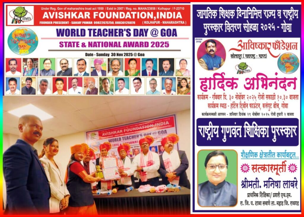महाड प्रतिनिधी / महाड रायगड जिल्ह्याच्या शैक्षणिक आणि सामाजिक क्षेत्रात आपले नाव उंचवणाऱ्या महाड तालुक्यातील जिल्हा परिषद प्राथमिक शाळा सर्वांनी येथील आदर्श प्रभारी मुख्याध्यापिका श्रीमती मनीषा संपत लावरे यांना राष्ट्रीय स्तरावरचा सर्वोच्च सन्मान मिळाला आहे. अविष्कार सुशील अँड एज्युकेशन फाउंडेशन एनजीओ तर्फे त्यांना मानाचा राष्ट्रीय स्तरीय आदर्श शिक्षक पुरस्कार 2025 प्रधान करण्यात आला हा पुरस्कार 30 नोव्हेंबर 2025 रोजी गोवा राज्यात कलंगुट येथे झालेल्या राष्ट्रीय स्तरीय सोहळ्यामध्ये श्रीमती मनीषा लावरे यांना गौरव करण्यात आला मान्यवरांच्या उपस्थित सन्मान वायुसैनिक व साहित्यिक माननीय श्री एमडी देसाई यांच्या अध्यक्षतेखाली असोला पार पडला यावेळी गुवाहाटी आसामचे ज्येष्ठ समाजसेवी माननीय डॉक्टर पंकज लोचन भविष्य कोहिनूर मेटिलिक्स चेअरमन माननीय श्री संजय भगत अविष्कार फाउंडेशन चे राष्ट्रीय अध्यक्ष माननीय संजय पवार यांच्यासह अनेक मान्यवरांनी श्रीमती लावरे यांचा मनाचा कोल्हापुरी फेटा सन्मानचिन्ह मंथ पत्र देऊन सन्मानित करण्यात आले सर्विंग विकासाचे कार्य एक तंत्रस्नेही आदर्श शिक्षिका श्रीमती मनीषा लावले यांनी आपल्या पंचवीस वर्षाहून अधिक कालच्या अध्यपनाच्या कार्यात केवळ वर्गापूर ते मर्यादित न राहता अनेक महत्वपूर्ण क्षेत्रामध्ये भरीव योगदान दिले आहे श्रीमती लावणे आपल्या अध्यापन पद्धतीमध्ये तंत्रज्ञानाचा प्रभावी वापर केला आहे विद्यार्थ्यांना आधुनिक शिक्षणाचे धडे देण्यासाठी त्या डिजिटल साधने ऑनलाईन प्लॅटफॉर्म आणि नवनीत शैक्षणिक ॲप्स यांचा उपयोग करताना तंत्रज्ञानाच्या साह्याने त्यांनी अध्यापनात नावीनता आणली आणि विद्यार्थ्यांचे शिक्षण अधिक मनोरंजन व सोपे केले श्रीमती लावरे यांच्या या सार्वजनिक सर्वांगीण कार्यामुळे रायगड जिल्ह्याचे नाव राष्ट्रीय स्तरावर उंचावले असून त्यांच्या या योगदानाबद्दल सर्व स्तरातून अभिनंदन होत आहे.