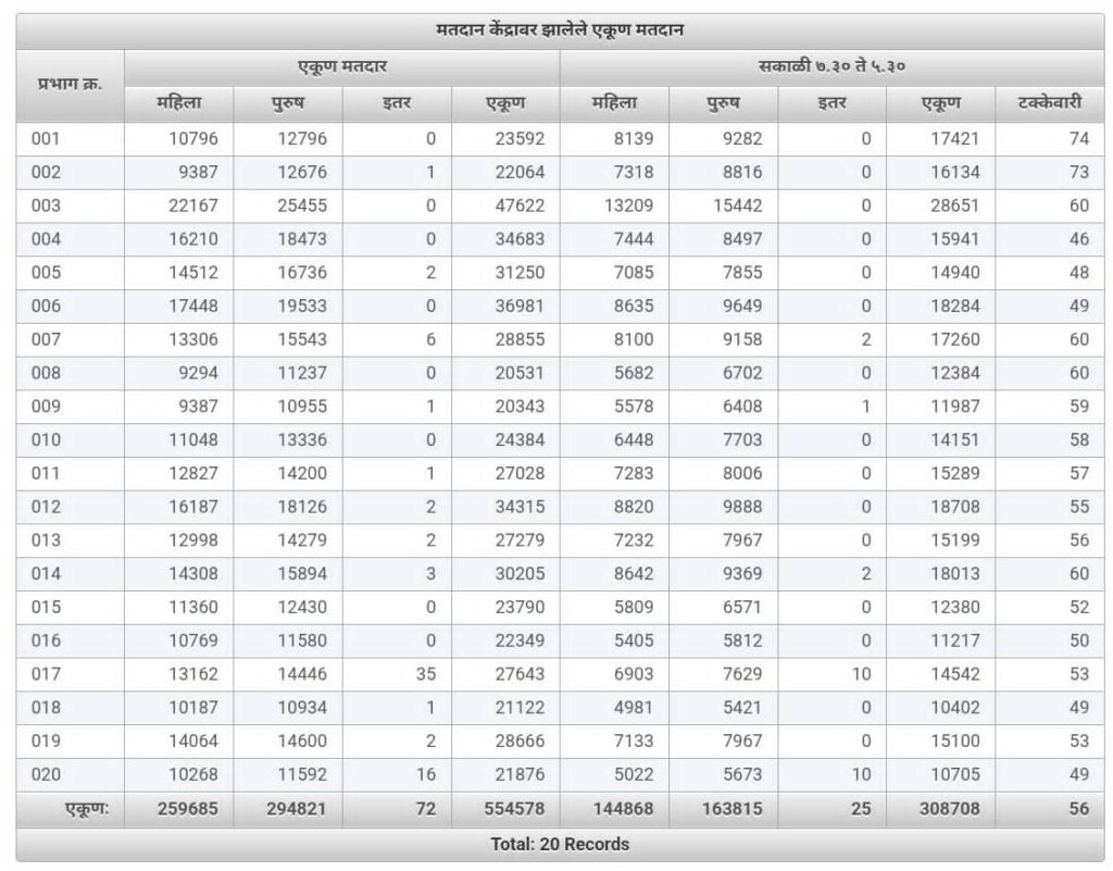 रायगड लोकधारा प्रतिनिधी पनवेल : पनवेल महानगरपालिका सार्वत्रिक निवडणुक महापालिका आयुक्त तथा मुख्य निवडणूक अधिकारी मंगेश चितळे यांच्या मार्गदर्शनाखाली दि. 15 जानेवारी रोजी 656 मतदान केंद्रावरती 78 जागांकरिता नियोजनबद्ध पद्धतीने शांततेत पार पडली. या सार्वत्रिक निवडणुकीमध्ये 55.67 टक्के मतदारांनी मतदान केले. पनवेल महानगरपालिका क्षेत्रातील 20 प्रभागांमध्ये 78 जागांसाठी ही निवडणूक बहुसदस्यीय पॅनल पद्धतीने निवडणूक घेण्यात आली.