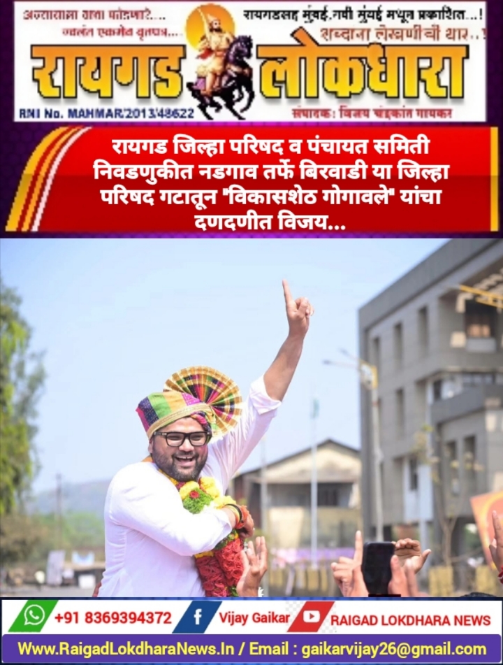 रायगड लोकधारा प्रतिनिधी : महाड/ रायगड : स्थानिक स्वराज्य संस्थेतील हा विजय म्हणजे त्यांच्या विकासात्मक राजकारणातील पहिलं ठाम पाऊल आहे. कोकणात युवा सेनेचे नेतृत्व करताना त्यांनी संघटन कौशल्य, जिद्द, मेहनत आणि लोकांशी असलेलं नातं याच्या जोरावर स्वतःचं वेगळं स्थान निर्माण केलं आहे. आज जनतेने त्यांच्या कामावर विश्वास ठेवत दिलेला कौल हा केवळ विजय नसून जबाबदारीची जाणीव करून देणारा आहे.