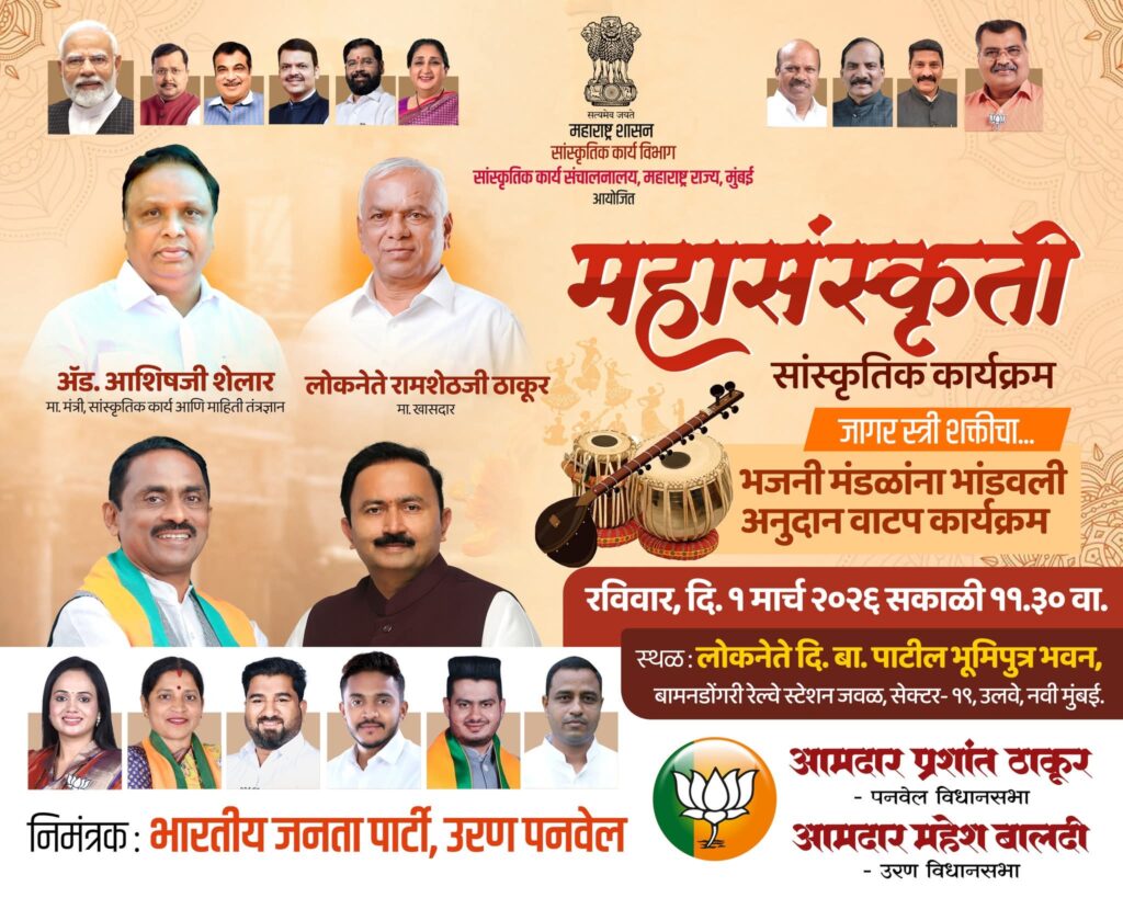 पनवेल प्रतिनिधी : महाराष्ट्र शासनाच्या सांस्कृतिक कार्य विभाग आणि सांस्कृतिक कार्य संचालनालय यांच्या वतीने महासंस्कृती जागर स्त्री शक्तीचा या सांस्कृतिक कार्यक्रमाचे आयोजन करण्यात आले आहे. हा कार्यक्रम रविवार दि. ०१ मार्च, २०२६ रोजी दु. १२:०० वाजता लोकनेते दि.बा. पाटील भूमिपुत्र भवन, उलवे नोड येथे संपन्न होणार आहे.
